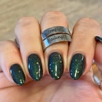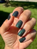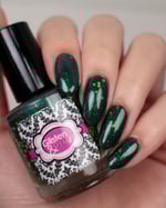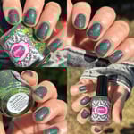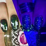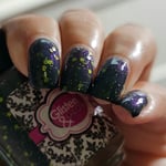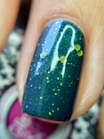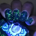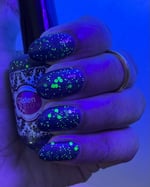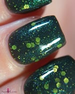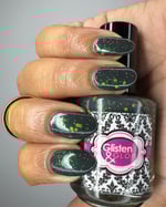 Glisten & Glow - Witch’s Cauldron – black based jellie polish with color shifting shimmer that shifts green/aqua/purple/red and various sized neon green glitters (glitters glow under blacklight)