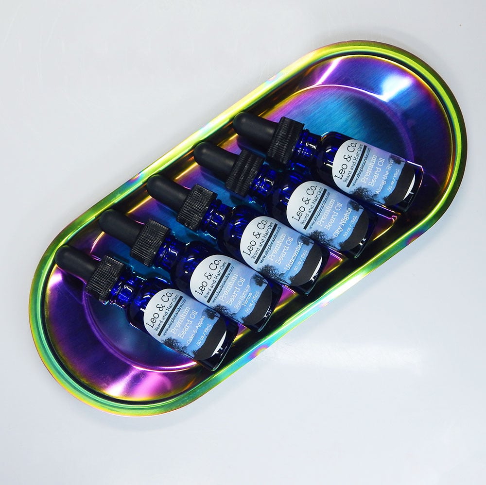 You will get a .50 oz size /15 ml size blue glass bottle of Leo & Co. premium beard oil! It will come with a screw cap and a dropper inside of a plastic bag! You can store your cap or dropper inside this bag when not in use! And a great instruction card that explains how to use the product! New or Old beard oil users, we have got you covered! And the size...it's perfect for travel (TSA approved) or on the go! We want your beard to be on point always!